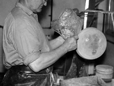 Cut glass" refers to crystal glassware that has been decorated entirely by hand using rotating abrasive wheels to cut patterns into the glass surface. One of the oldest traditional methods of glass decoration, cut glass dates back many centuries, with artifacts from the sixth century B.C. indicating its use by the ancient Romans and Babylonians. The technique reached the Czech Republic by the end of the sixteenth century, and soon became a defining element of Bohemian crystal design.