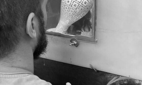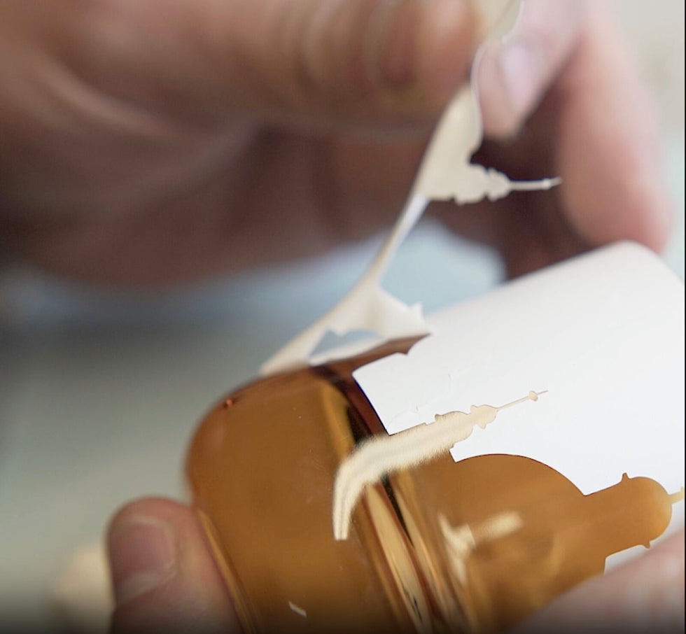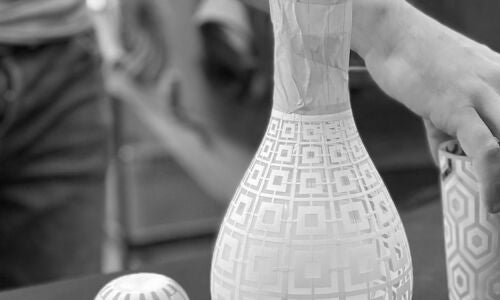 Some of ARTĚL’s most interesting motifs are created using a technique known as sandblasting, a multi-step process developed in 1886 in which glass is ground by hand to produce a matte finish. In the first step of this process, a stencil-like “mask” must be applied by hand to each piece. A special gun is then used to apply a pressurized spray of grinding sand to the unmasked areas. This requires great skill on the part of the artisan, who must control the texture and depth of the design by varying the volume and duration of each sandblast.